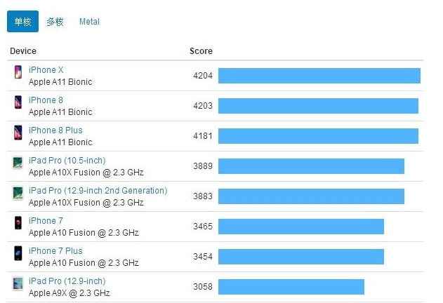 中国的手机厂商喜欢跑分,A11在Geekbench上的跑分显示,单核性能平均4169,多核性能平均9836。上一代A10的单核性能平均3332,多核性能平均5558,提升30%和50%。而高通骁龙835的GeekBench成绩为单核2000左右,多核6500左右,苹果A11吊打安卓旗舰芯片。