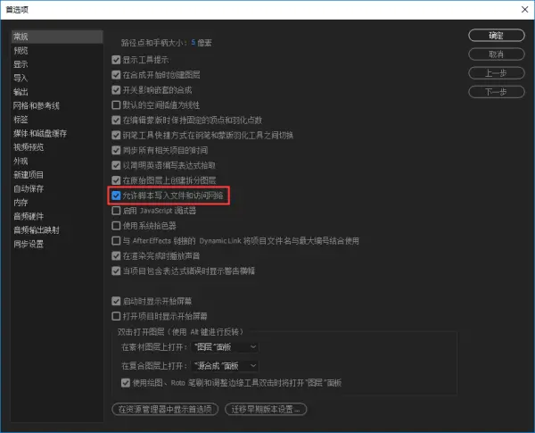 3. 打开AE,点击“编辑”>“首选项”>“常规”菜单项,选中“允许脚本写入文件和访问网络”,点击确定。