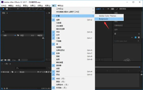 4. 点击“窗口”>“扩展”>“Bodymovin”菜单项,就可以打开Bodymovin的界面使用插件了。