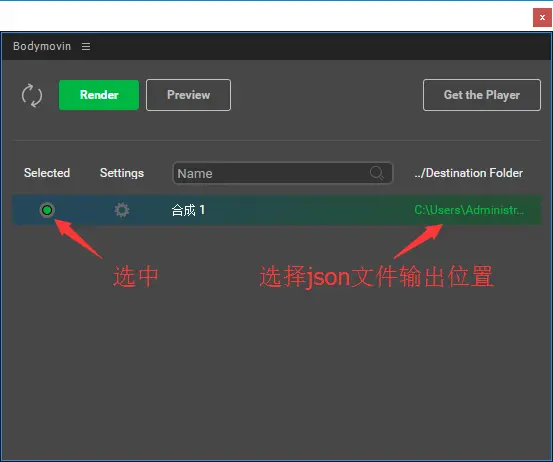 6. 打开Bodymovin插件窗口,可以发现“合成1”出现在了下面的列表中。选中“合成1”,设置好json文件输出位置,点击“Render”。