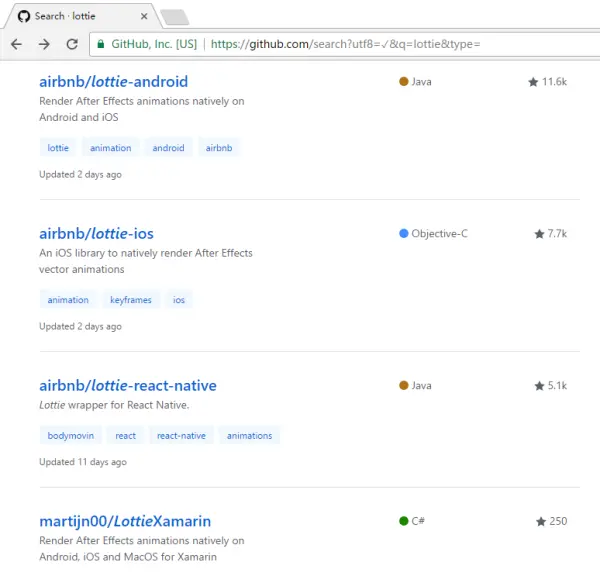 10. 如果想让json版动画跑在Android/iOS设备上,在GitHub上搜索“lottie”,然后选择自己感兴趣的平台吧。