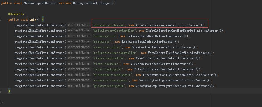 annotation-driven注解做了什么,直接看AnnotationDrivenBeanDefinitionParser类。这个类中主要的就是parse方法,这个方法中做了很多重要的事,如对一些可扩展的参数进行了解析注册,这些不是本篇的重点,有兴趣的可以研究一下,关注重点代码。