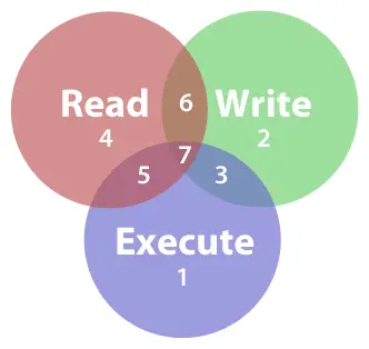即,1 表示可执行,2 表示可写,4 表示可读。每种类型数字相加所得到的值表示交叉部分的公共类型。