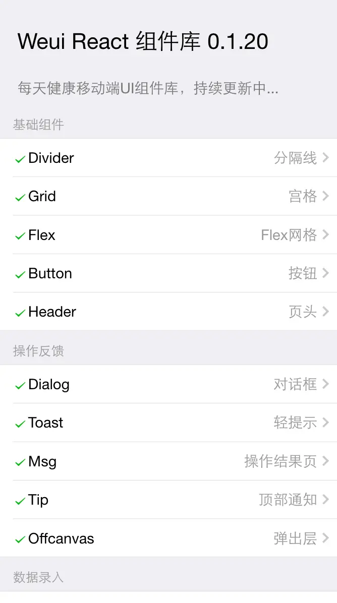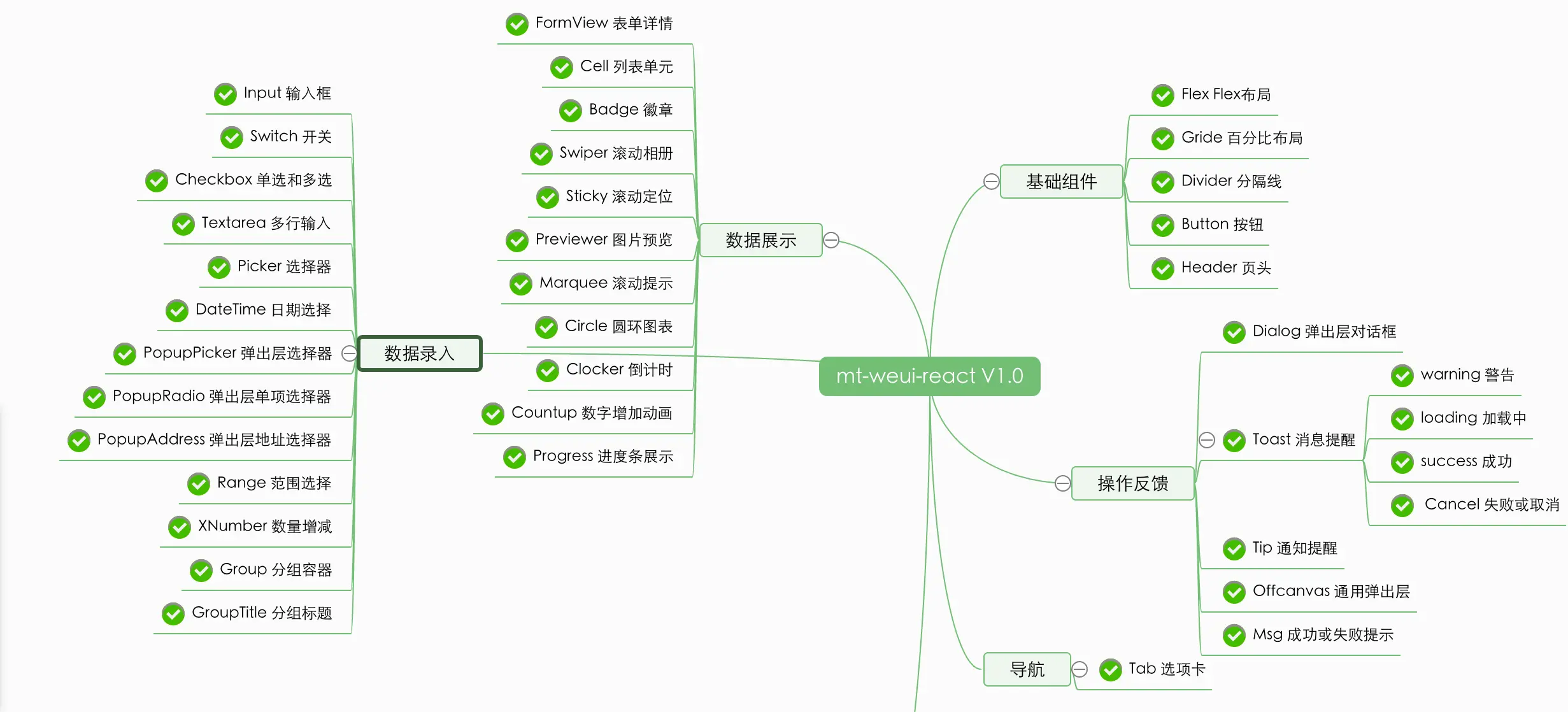 mt-weui-react v1.0 版本包含基础类、交互反馈类、数据展示类、数据录入类、导航类等多,已有 37 个基础组件,未来还会添加更多基础组件和业务组件以增强数据交互和展示。