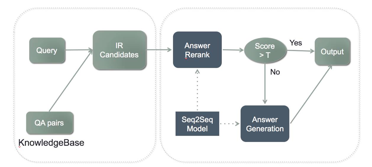 因此在阿里小蜜的聊天引擎中,我们结合了两者各自的优势,将两个模型进行了融合形成了阿里小蜜聊天引擎的核心。先通过传统的检索模型检索出候选集数据,然后通过Seq2Seq Model对候选集进行Rerank,重排序后超过制定的阈值就进行输出,不到阈值就通过Seq2Seq Model进行答案生成,整体流程图16:
