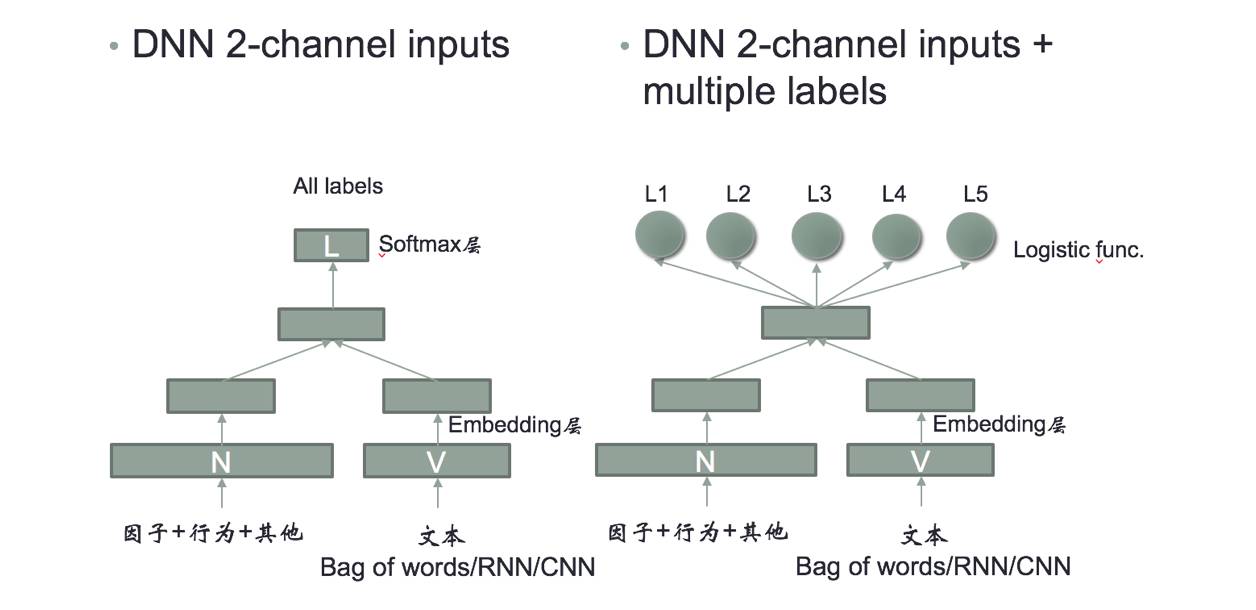在基于深度学习的分类预测模型上,我们有两种具体的选型方案:一种是多分类模型,一种是二分类模型。多分类模型的优点是性能快,但是对于需要扩展分类领域是整个模型需要重新训练;而二分类模型的优点就是扩展领域场景时原来的模型都可以复用,可以平台进行扩展,缺点也很明显需要不断的进行二分,整体的性能上不如多分类好,因此在具体的场景和数据量上可以做不同的选型。