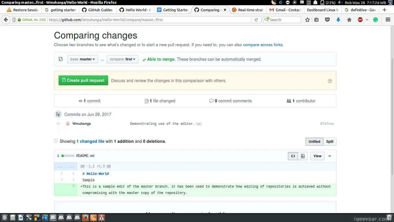 - 选择 readme-edits 分支与 master 分支进行比较。