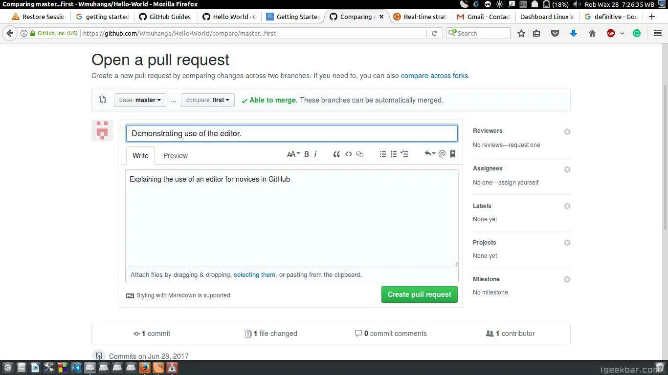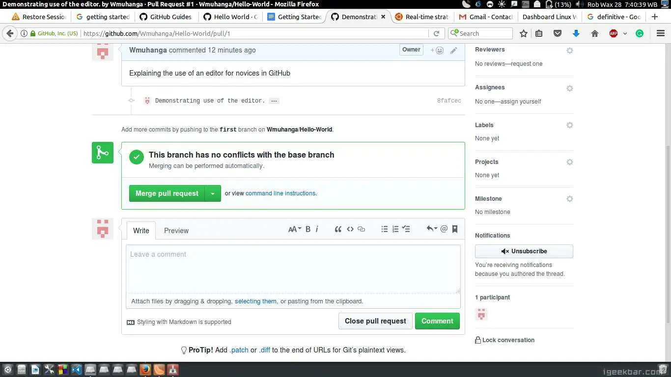 最后一步是将 readme-edits 分支和 master 分支合并到一起。如果 readme-edits 分支和 master 分支不会产生冲突,则会显示merge pull request合并拉取请求的按钮。
