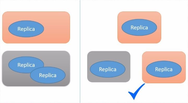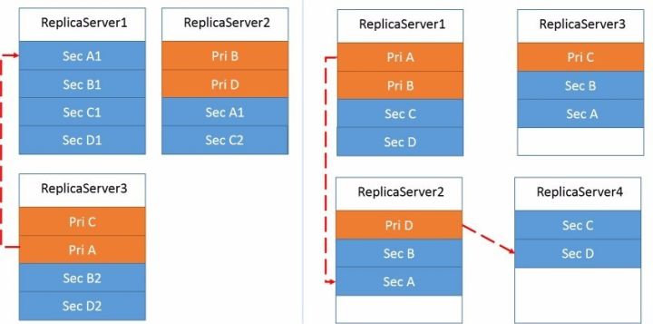在左图里,4 个 Primary 分布在 ReplicaServer2 和 ReplicaServer3 上,而 ReplicaServer1 上没有任何 Primary。这时候,通过把 ReplicaServer3 上的 Primary A 和 ReplicaServer1 上的 Secondary A 做角色对调,就可以满足 Primary 的均衡。