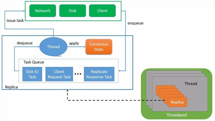 另外,为了避免创建过多的线程,我们采用了线程池的做法。一个“一致性状态”的数据结构只会被一个线程进行修改,但多个结构可能共享一个线程;replica 和线程的,是多对一的关系。