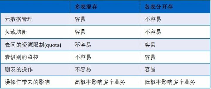 那么这两种方案到底哪一个更好呢?从理论上来说,我们认为多表混存方案更好,因为它更符合软件工程中分层的思想;混存也更容易实现,因为只需要管理一份元数据,负载均衡也更为简单。但是从业务角度来看,采用各表分开存的方案更好。因为分开存意味着更简单的表间资源限制、表级别的监控和删除表的操作。考虑到运维上的误操作,分开存储也更有优势,即使你误删了一个 partition,该错误操作扩散给不同业务的影响也是要少一些。