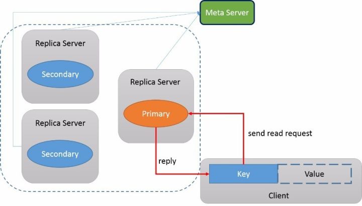 Pegasus 的读请求流程图读请求操作更加简单,客户端直接和 primary 发起读请求,primary 因为拥有全部数据,所以直接进行响应。
