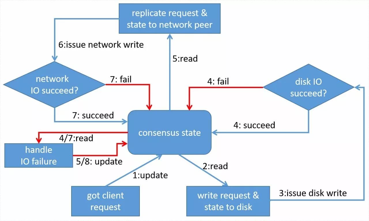 从上图可以看出,当客户端发起一个写请求后,这条请求会先后产生写本地磁盘、以及发送网络 RPC 等多个事件,无论事件成功还是失败,都需要对公共的一致性状态进行访问或修改。这样的逻辑,会使得我们要对一致性状态进行非常繁琐的线程同步,是非常容易产生 bug 的。