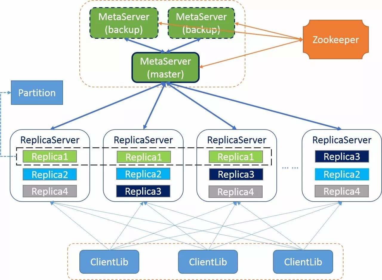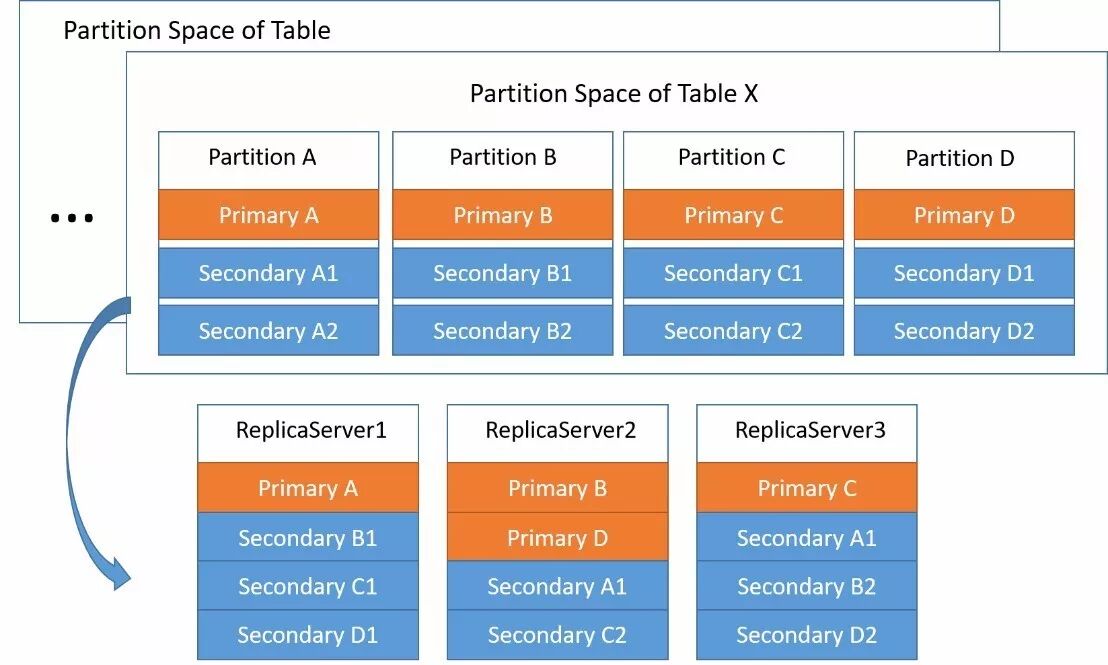 为了对抗单个 ReplicaServer 的失效,每个 Partition 都有三个副本,分散到不同的 ReplicaServer 上。