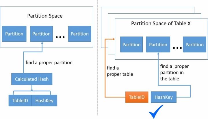 而对于分开存而言,把表的语义下推到了存储层。如上图的右半部分所示:每个表都有一个单独的 partition space,当有一个读写请求时,要先根据表 ID 找到对应的 partition space,再根据 hash key 去找对应的 partition。