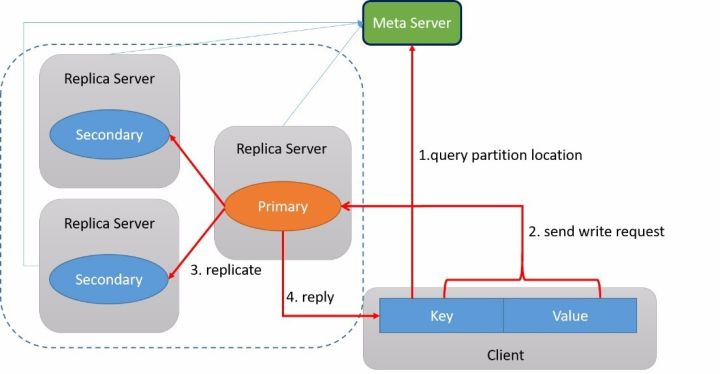 Pegasus 写请求流程在 PacificA 协议里边,负责接受读写请求的叫做 primary,相当于 Raft 中的 leader;另外两个接受 replication 请求的是 secondary,相当于 Raft 中的 follower。在如此架构下,对一个 partition 写请求也比较简单:如果客户端有一个写请求,首先需要向 MetaServer 来查询 Key 的位置,之后再向 primary 所在的 ReplicaServer 发起写请求,然后 primary 将其同步给 secondary,二者都成功后再返回客户端写请求成功的回复。