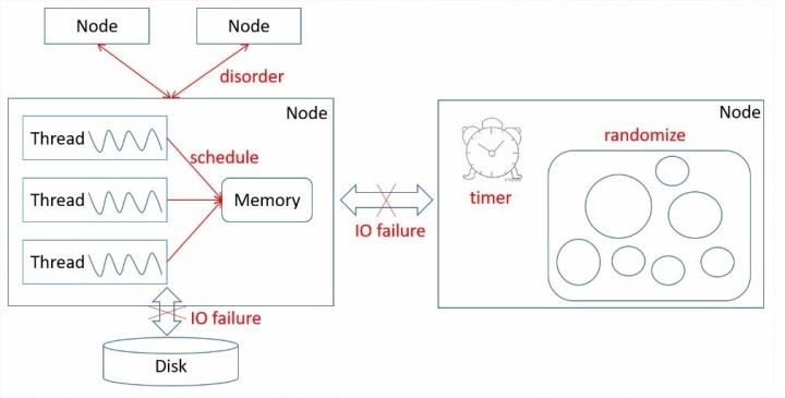 程序自身的随机:系统 API 如调度、定时器、随机数的使用,以及多节点间的并行。