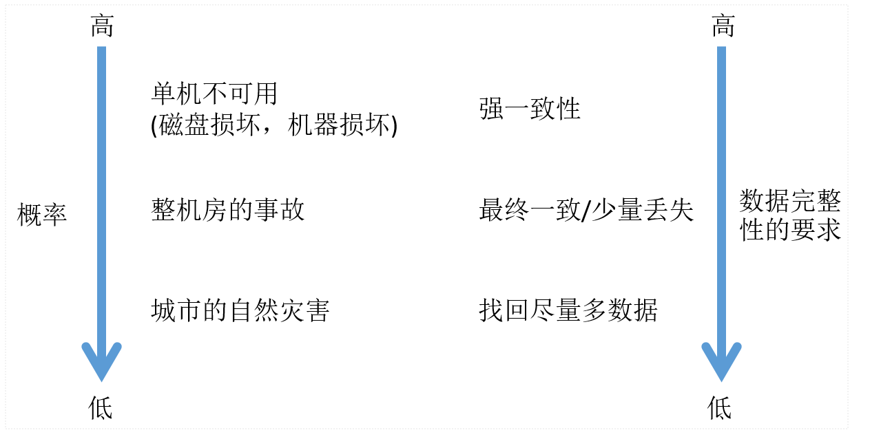 通过对这个问题进行反思,我们认为我们其实钻了一个“要做完美系统”的牛角尖。就业务的角度来看,作为一个完善的存储系统,的确要对各种各样的异常情况都需要做好处理。但随着异常情况发生概率的降低,业务对一致性的要求其实也是逐步放宽的: