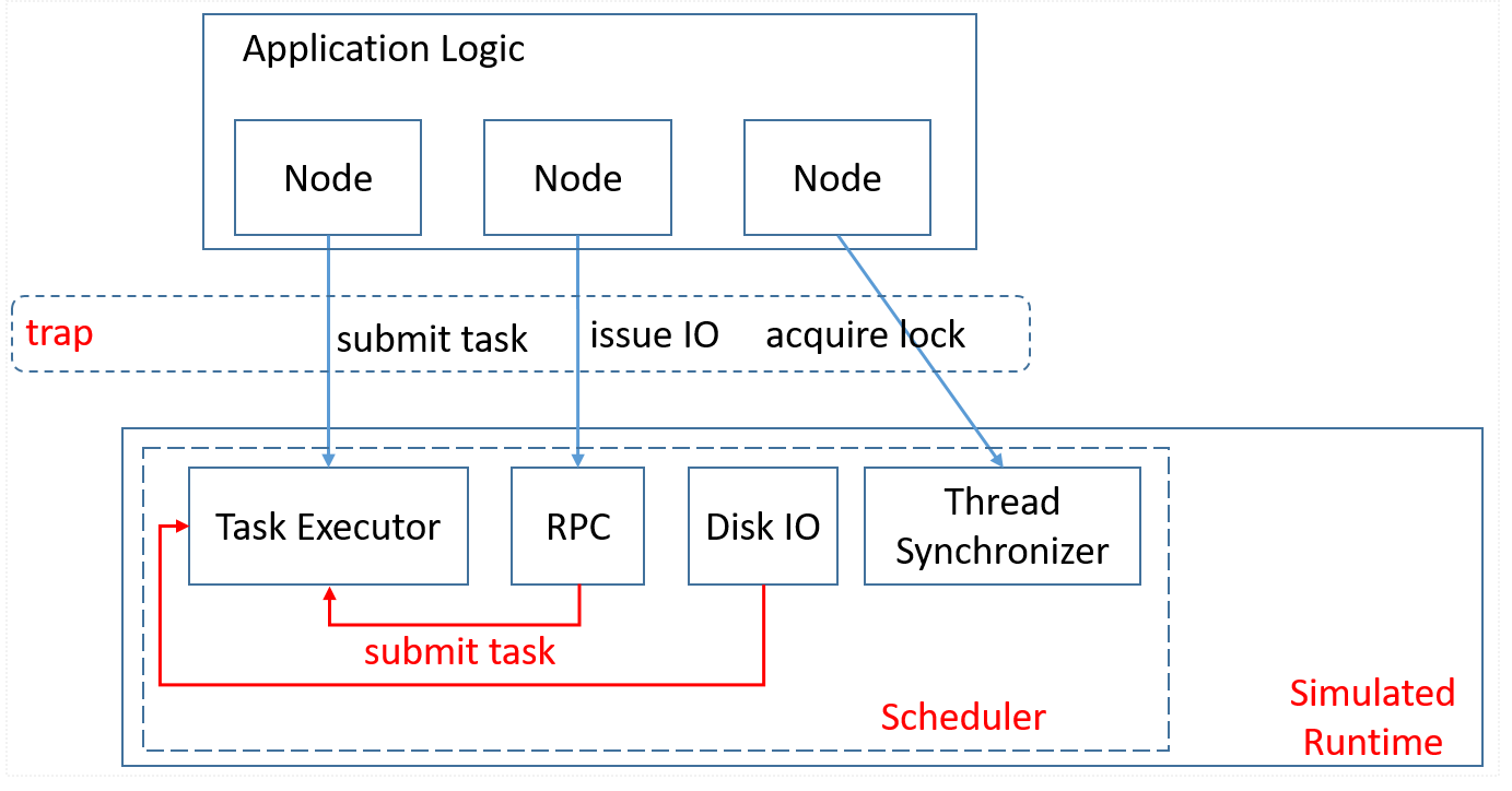 产生不确定性的接口提供抽象层。当前系统一共提供了线程池、RPC、磁盘 IO、线程同步和环境操作 5 种抽象接口。每种接口都有模拟实现 (测试) 和非模拟实现 (部署运行),分布式业务逻辑 (Application Logic) 的代码只调用系统的抽象接口 (Runtime)