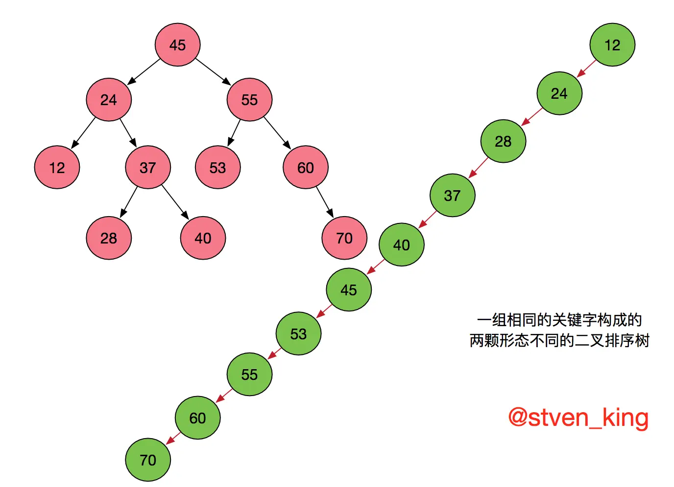 - 若右子树不空,则右子树上所有结点的值均大于或等于它的根结点的值;