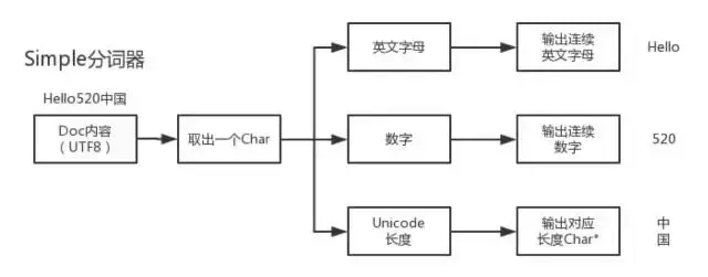 Simple分词直接处理的UTF8编码的Doc内容,通过单个char,判断当前字符的Unicode编码范围和Unicode编码长度,根据不同的情况做出不同的处理。