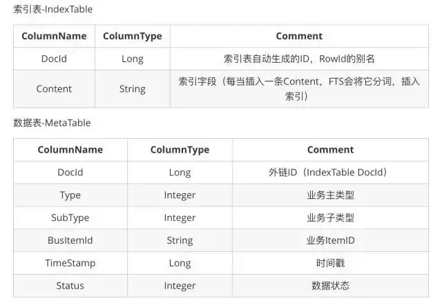IndexTable负责全文搜索的索引建立,它和逻辑无关,当搜索关键词时,只需要找到对应的DocId即可。MetaTable负责业务逻辑的过滤,通过Type和SubType来过滤对应业务的数据,最后输出BusItemId。