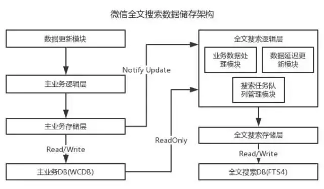 独立DB、读写分离:微信全文搜索在整体架构上独立于主业务,搜索DB也是独立于主业务DB;当主业务数据发生更新时,主业务通过EventBus方式通知搜索对应的业务数据处理模块,业务数据处理模块会通过一个独立的ReadOnly数据库连接接访问主业务数据库,不和主业务存储层共享数据库连接。