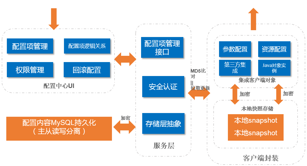 ● 客户端:应用本地保存配置snapshot加密文件,提升安全性和可用性,通过配置项MD5比对判断是否更新,拉取配置后动态更新本地对象实例。