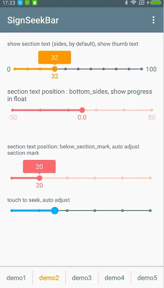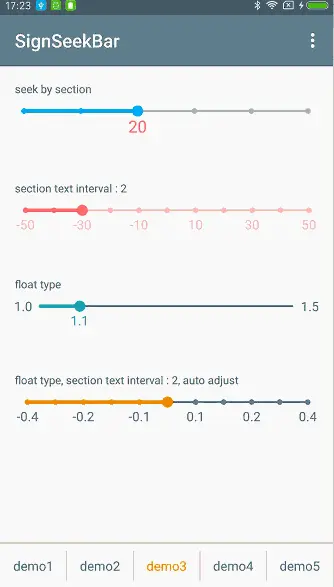 本库主要提供一个漂亮而强大的自定义SeekBar,进度变化由提示牌 (sign)展示,具有强大的属性设置,支持设置section(节点)、mark(标记)、track(轨迹)、thumb(拖动块)、progress(进度)、sign(提示框)等功能
