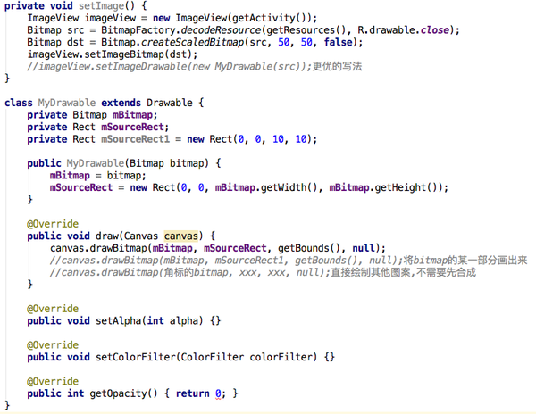 新手上来可能就对图片进行缩放,这里演示代码还好,有时候我们要做一些图像合成,比如在图片上面加个角标,那在内存里面(特别很可能是在UI线程)先合成一个Bitmap,再设给ImageView,这个合成过程完全是徒劳的,既费时间又费空间。这个例子体现出来对Drawable的理解不够深刻,刻板机械的使用导致写出来的代码效率不高。