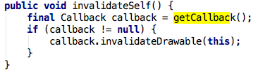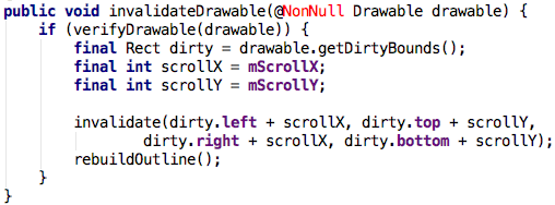 - setCallback 这个函数非常重要,以ImageView为例,给它设置了Drawable之后,就会调用drawable的setCallback方法,将View自己传进来,保存到drawable的mCallback里面。在调用下面会说到的invalidateSelf函数时,就会调用mCallback的invalidateDrawable方法,这个mCallback也就是view自己,最终会调用view的invalidate进行重绘。这样drawable的请求重绘就和view关联起来。