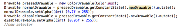 - setAlpha 设置透明度,这个在有时候实现按钮点击上很有帮助,比如不可点是5%透明度,正常是70%透明度,按下是100%透明度,就可以这样实现selector: