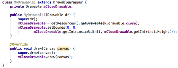 - DrawableWrapper 是个非常有用的抽象类,借助他可以非常方便的对已有的drawable进行包装,做一些其他事情,比如还是给图片画个角标,可以这样写: