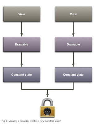 - mutate 这个方法要是不了解就谈不上进阶drawable。刚才讲到newDrawable之后ConstantState是同一个,但这样会有问题,两个人用同一个会导致有些属性无法单独修改,这个时候就需要用到mutate方法,他的作用就是在复制一份ConstantState,让newDrawable出来的对象也拥有自己的ConstantState,这样他们之间就不会互相干扰。这里需要注意的时候对于BitmapDrawable虽然mutate了,ConstantState也是各自有一个,但ConstantState里面的bitmap还是只有一份,这个应该是没有任何异议的(否则太傻了),mutate可以理解为深拷贝。这里引用著名的图来说明mutate到底解决什么问题: