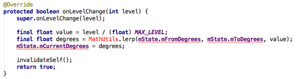 - setLevel 这个函数很有意思,在一些有过程的Drawable实现里面可以定位到具体某一帧,比如RotateDrawable: