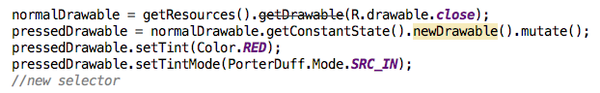 这个API很好用,以往我们做个按下效果可能需要切2张图,现在结合上面讲的mutate等方法,很方便的就能给图标换个颜色来实现按下效果(注意这个方法高版本才有,低版本上面可以借用support包来实现类似效果)。比如: