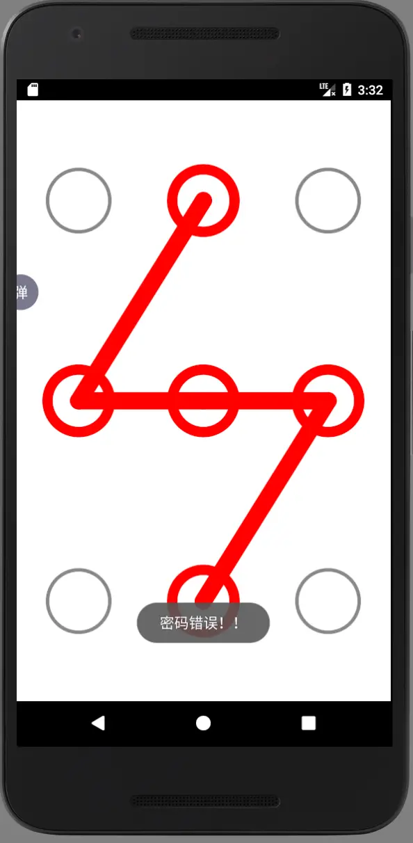 - 分析一下,android锁屏一般为九宫格,将屏幕九等分,以每部分的中点为圆心画圆,每个圆有默认状态和连接状态以及错误状态,根据触摸区域判断触摸的点,在onDraw里画出点和线,在需要的地方设置Paint的颜色等属性后postInvalidate一下,这样来实现点的不同状态的显示。每连接一个点都将此点的下标存入数组,可在activity设置开锁密码,连接完后判断是否正确。