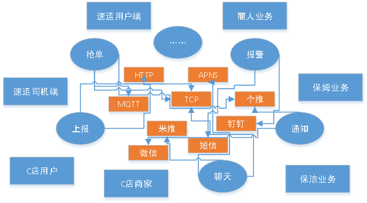 为了应对业务的快速发展,初创公司都会选择最容易实现的方法和框架。58到家也一样,结果建设了众多的消息系统(如图1),散落在各个业务线。有的用MQTT、有的用HTTP、有的用个推、有的用米推,消息协议不一致,互联互通存在障碍。研发人员需要熟悉多套消息系统,研发效率低下,研发质量很难保证。