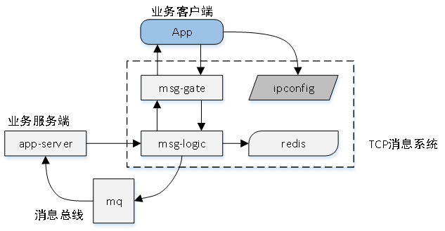 虚线框描述了TCP消息系统的功能组成。包括接入层(msg-gate)、逻辑层(msg-logic)、ip配置(ipconfig)、路由缓存(redis)四大部分。