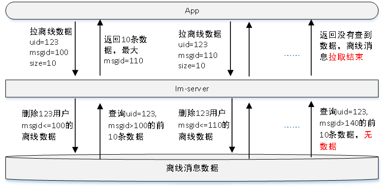 ●消息服务器将这10条数据返回App端,完成1页离线数据拉取。