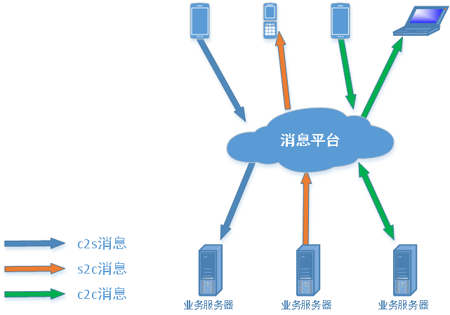 图中上边一排的手机和笔记本图标在消息系统中被称为端,或者客户端,英文用client表示。中间云的图标是我们的统一消息平台。下边的服务器图标是业务服务器,英文用sever表示。