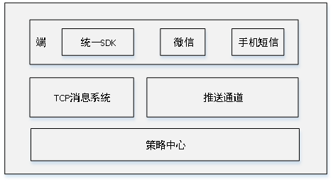 如图2所示,统一消息平台主要包括四大部分:TCP消息系统、推送通道、策略中心、端。