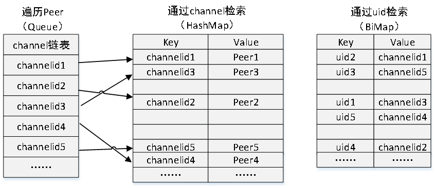 ●右侧的双向Map保存uid和channelid的映射关系,双向Map可以根据uid检索channelid,也可以根据channelid检索uid,为什么用双向结构,后续会提到。