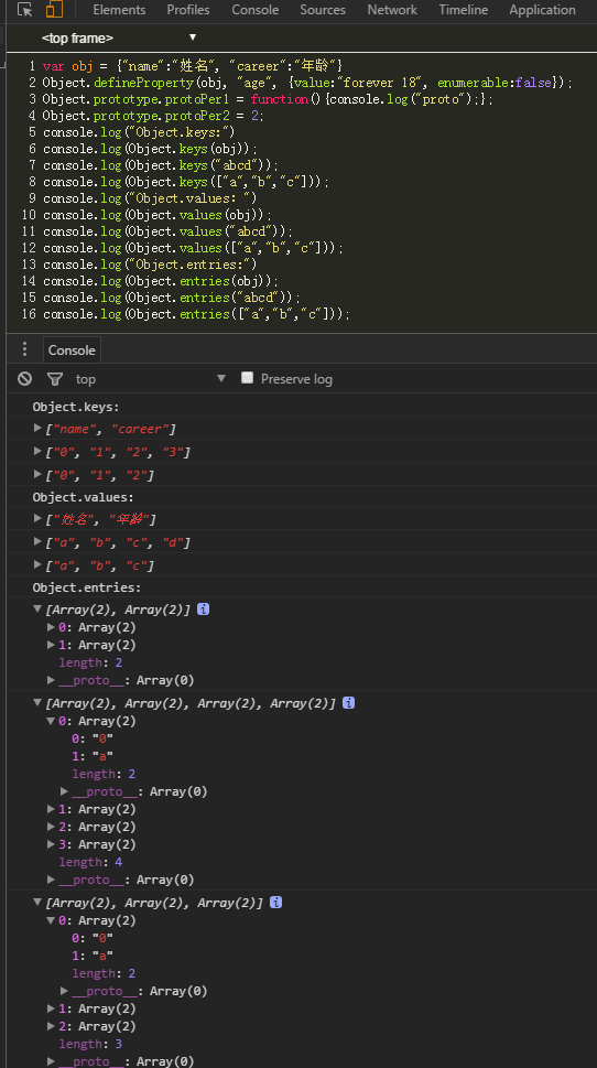 Object.entries方法返回一个数组,成员是参数对象自身的(不含继承的)所有可遍历( enumerable )属性的键值对数组。