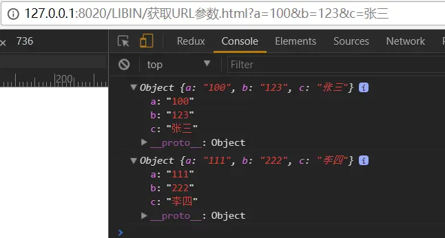 console.log(GetURLval('?a=111&b=222&c=李四'));