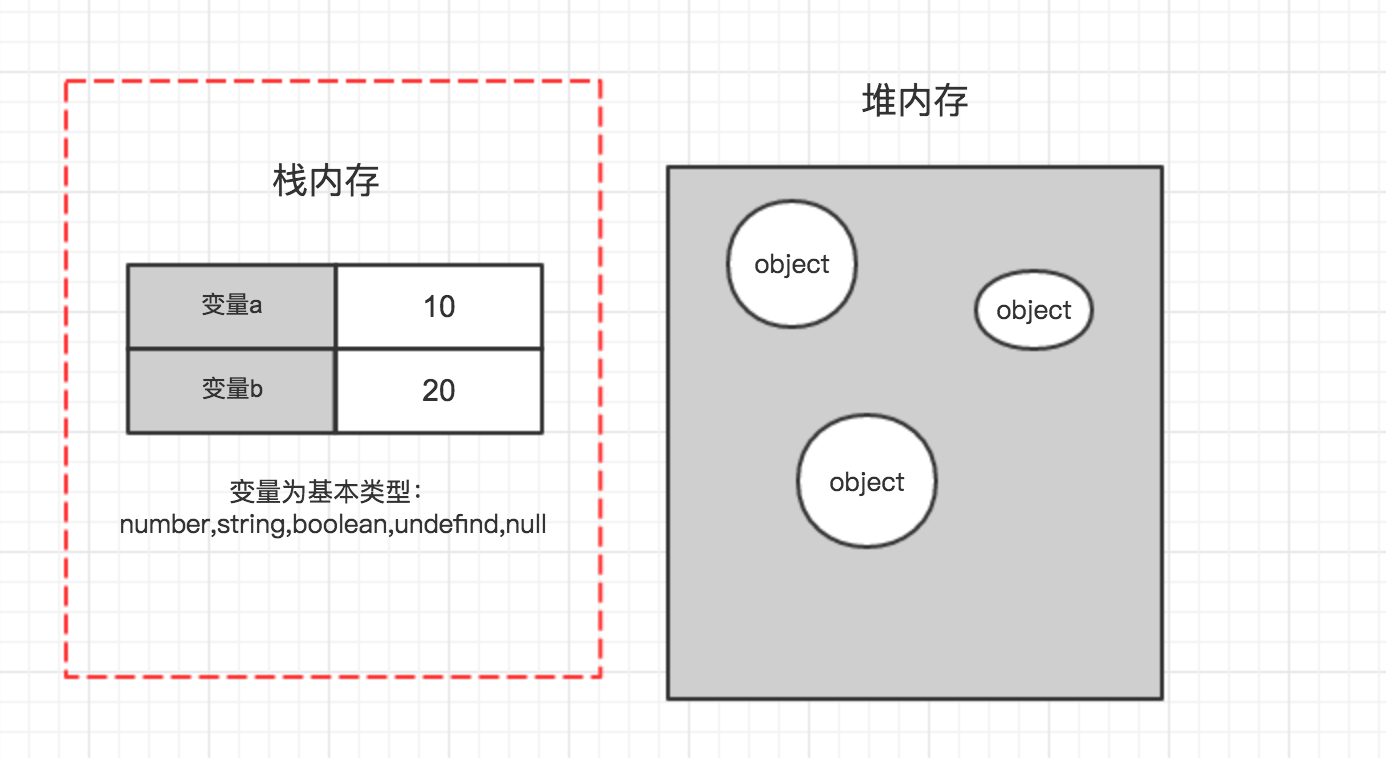 对于number,string,boolean,undefined,null这些基本类型变量,值存在栈中: