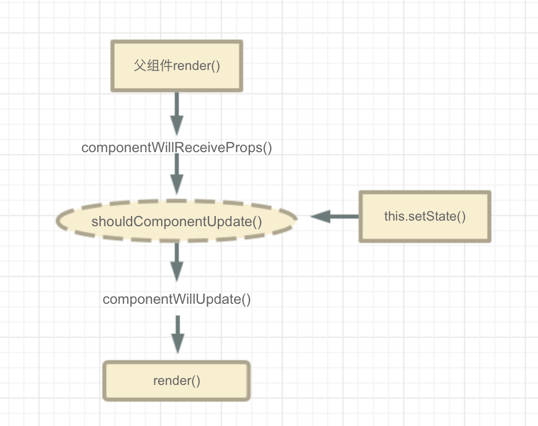 于是这里react生命周期中的shouldComponentUpdate函数就派上用场了!shouldComponentUpdate函数是重渲染时render()函数调用前被调用的函数,它接受两个参数:nextProps和nextState,分别表示下一个props和下一个state的值。并且,当函数返回false时候,阻止接下来的render()函数的调用,阻止组件重渲染,而返回true时,组件照常重渲染。