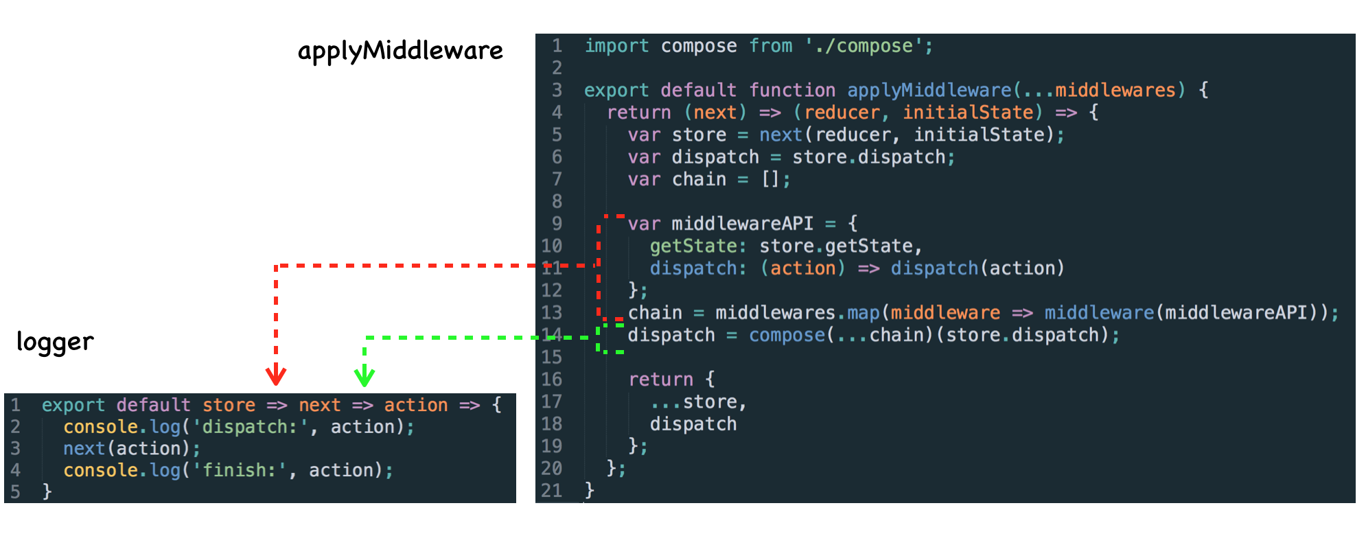 redux 提供了 applyMiddleware 这个 api 来加载 middleware,为了方便理解,下图将两者的源码放在一起进行分析。