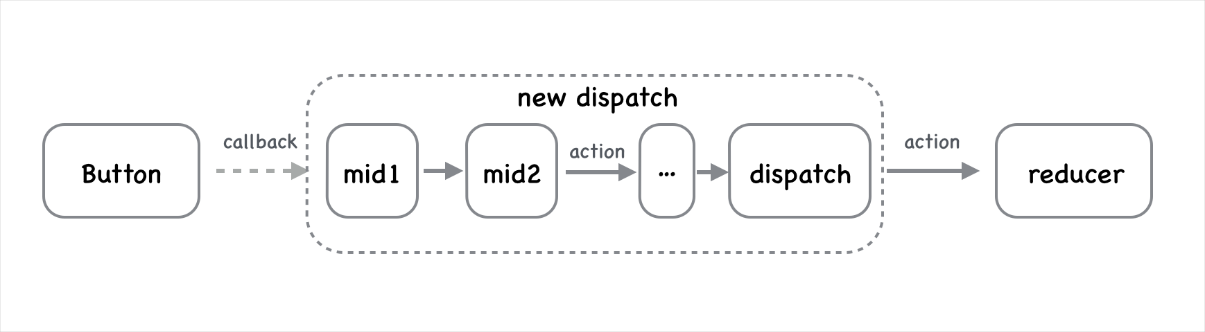 我们再想想,store.dispatch 的返回值是什么?不就是 action => {} 这样的函数吗?这样,一个中间件的 dispatch 传递完成了。我们理解了多中间件 compose 后可以为什么可以组成一个新的 dispatch 了(其实单一中间件也一样,但因为步骤只有一步,让人会想到直接触发 store.dispatch 上,多中间件提炼了这个行为,上升到组合为新的 dispatch)。