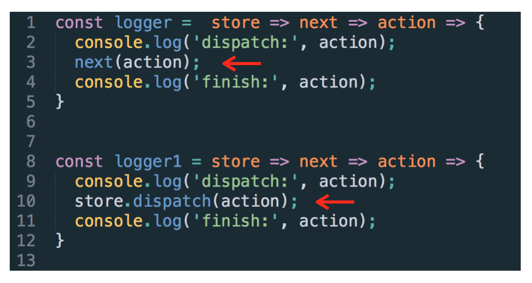 经过 compose,所有的 middleware 算是串联起来了,可是还有一个问题,我们有必要挖一挖。在 step 2 时,提到过每个 middleware 都可以访问 store,即 middlewareAPI 这个变量,所以就可以拿到 store 的 dispatch 方法,那么在 middleware 中调用 store.dispatch() 会发生什么,和调用 next() 有区别吗?比如下图: